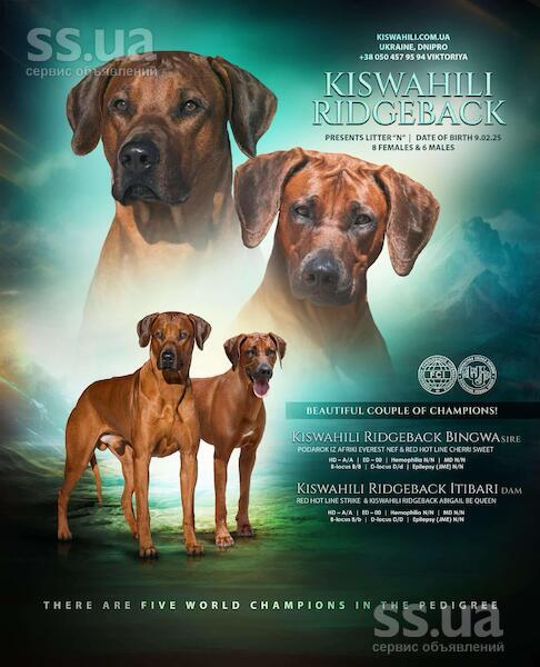 9 лютого 2025 року в розпліднику Kiswahili Ridgeback народилися щенята 6 хлопчиків та 8 дівчаток від мега гарної пари. Батьки тестовані на генетичні захворювання – здорові. На фото батьки цуценят. Шукайте нас у соцмережах на ім'я розплідника Kiswahili Ridgeback. Ціни різні.