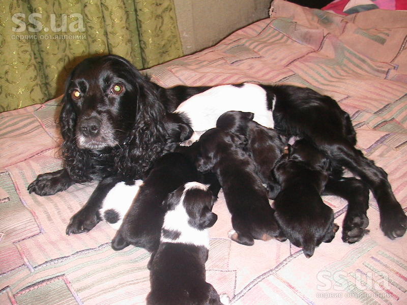 Продам щенков русский спаниель 1 мальчик черный с подпалом 5 девочек щенки родились 14 марта 2017 хвосты купированы павел