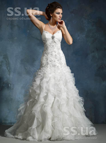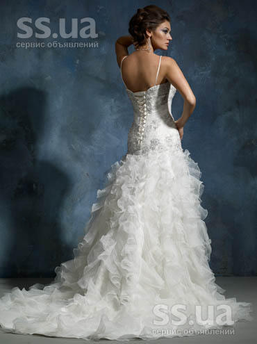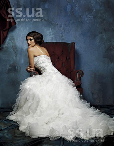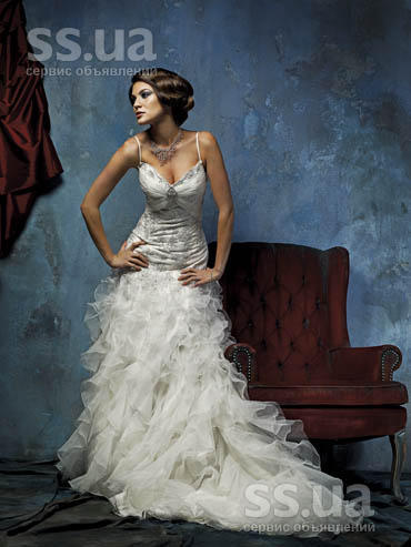 Мерцающая органза, вышивка металлизированной серебряной нитью, бисером, блестками, кристаллами Swarovski, шлейф при желании драпируется