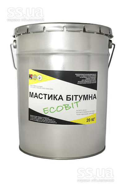 Мастика гідроізоляційна ЕКОБІТ холодного нанесення це готовий до використання однорідний склад чорного кольору. Виготовляється зі суміші сортів нафтового бітуму з додаванням мінеральних наповнювачів, спеціальних добавок, гумової крихти тонкого помолу, синтетичного бутадієн-стирольного каучуку та бензину-розчинника з температурою перегонки +160 С до +190 С.