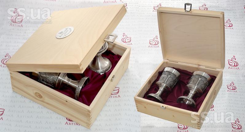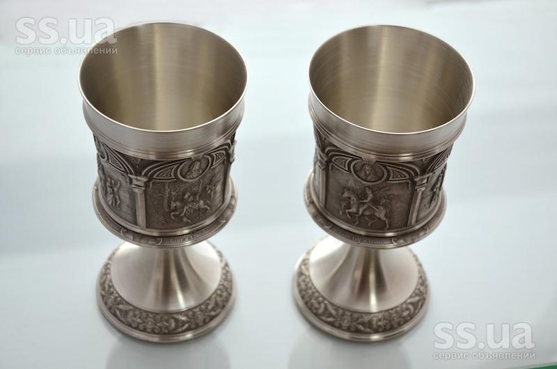 - 2 бокала изготовленных из цельного олова 95 %, со всех сторон размещены барельефы репродукций известных художников Дюрер Ры́царь, смерть и дья́вол (нем. Dürer „Ritter, Tod und Teufel“), Liebeshandel, Merktbauern.