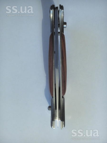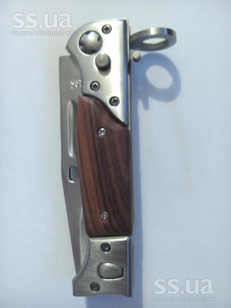 Сталь качественная не выкрашивается и не ржавеет. Накладки на рукояти выполнены из дерева. Раскрывается уверенно и надежно есть предохранитель и кнопка фиксации.