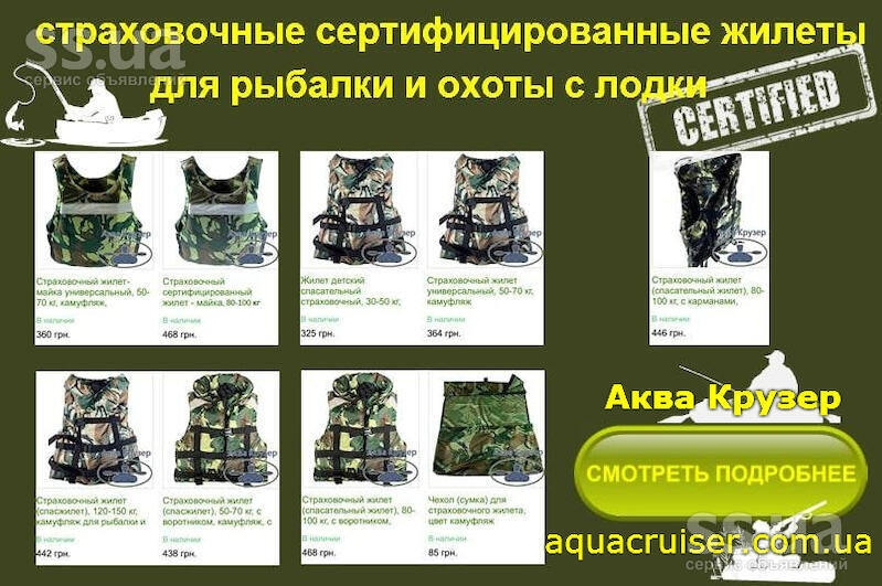 В специализированном лодочном интернет-магазине аква крузер (aquacruiser) вы можете купить сертифицированные страховочные жилеты (спасательные) украинского производства для рыбалки, охоты, занятий водными видами спорта и просто водных прогулок на лодках, катерах, байдарках, гидроциклах и др.